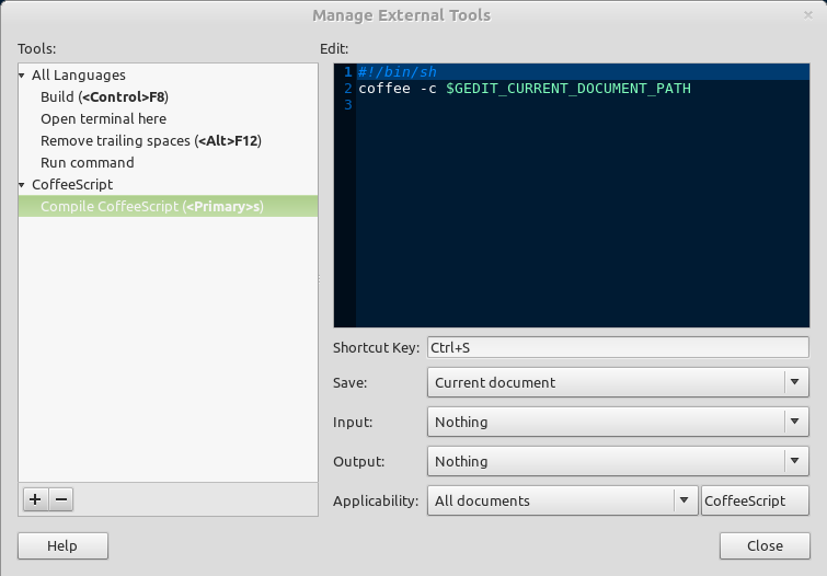 Now you can choose whatever shortcut you would like for this command. If you make sure to set the applicability to CoffeeScript files only and set Save to “Current Document”, then you can even set the shortcut to Ctrl + S. That works beautifully for me. The option to set the applicability to CoffeeScript only might only be available after installing the syntax highlighting for gedit mentioned earlier. Here’s what my settings for my compile CoffeeScript tool look like: