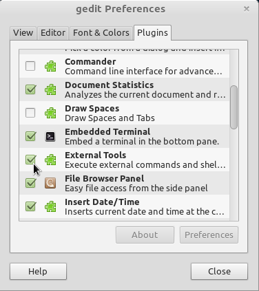 CoffeeScriptis a nice layer on top of JavaScript that takes away quite many of JavaScripts quirks and rough edges. I really like it as it makes development much more enjoyable to me. It compiles directly to JavaScript which is awesome for compatibility reasons. However that means whenever you change a file and want to test the changes you have to recompile the file. Some editors do this automatically. gedit however doesn’t have CoffeeScript support out of the box. That’s relatively easy to fix however. At first you should go ahead and install syntax highlighting for CoffeeScript. So now we got some nice syntax highliting, looks better right? The auto compile problem is also easy to fix. gedit comes with theExternal Tools plugin which makes it fairly easy to fix this when CoffeeScript is already installed properly (for installation information click here). At first you need to activate the External Tools plugin. Go to Edit->Preferences and then select the Plugins tab. It should look like this: