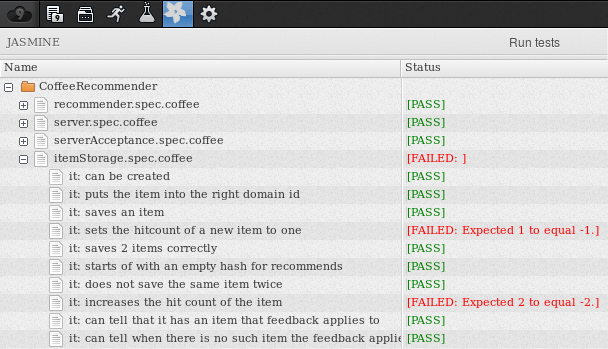 The panel is one of the common panels on the left hand side in the IDE. Here all recognized testing files are shown. In order to do this we rely on a convention: All test files are assumed to be in the spec folder of the project or in a sub-folder of the spec folder. In addition they should end in .spec.coffee , which is a convention introduced by Jasmine itself. Whenever tests have been executed then this panel can be used to see every single test case, with its description, and whether it passed or failed. Figure 4 is a screen shot of the panel with some failing tests.