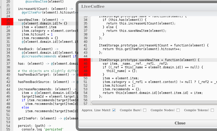 We extended the existing functionality with our fork of the plug-in [25] in three different ways. We improved the approximate line matching, provided a visual aid for the line matching and enabled other plug-ins to use part of the functionality of this plug-in through loose coupling. The approximate line matching was really approximate as it just took the current line and jumped to the same line in the JavaScript file. Unfortunately line matching is a broader but important problem. Due to the lack of viable alternatives at this point a new CoffeeScript compiler is being built, which will provide source mappings [21]. As this project is not yet ready to be used we decided to leverage the rich open source ecosystem a bit more. We incorporated the CoffeeScriptLineMatcher library [22] written by Steve Howell. This library matches blocks of CoffeeScript code to the corresponding blocks of JavaScript code. It does so by going through the code looking for statements, which can be determined to definitely be the same, like if statements or assignments. The visual aid works by coloring the matching block of lines of both the CoffeeScript and the JavaScript red as it can be seen in figure 3. Moreover the plug-in provides instant feedback, when the approximate line matching is enabled. Every time the position of the cursor in one of the windows is changed the current line in the other window is adjusted appropriately and the blocks are highlighted again. Refer to the screen cast [28] for more information. Also we enabled other plug-ins to use the functionality of the livecoffee plug-in. The coupling is very loose since you can not expect the plug-in to be loaded as it is not a default plug-in of Cloud9. We introduced the livecoffee_show_file event, which has to contain a line property. If the livecoffee plug-in is loaded, then it will open its window and go to the specified line in the JavaScript output window, highlight the block and also go to the same line in the matching CoffeeScript file. Other plug-in authors may use this functionality to enhance their support for CoffeeScript. We used it in our Jasmine test panel in order to go to the block in the CoffeeScript file which matches an error in the compiled JavaScript.