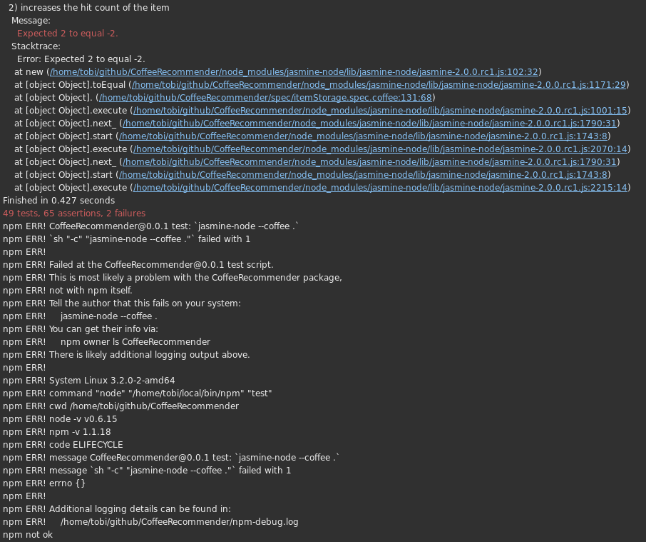 Figure 4: The Jasmine panel after tests with 2 failures ran