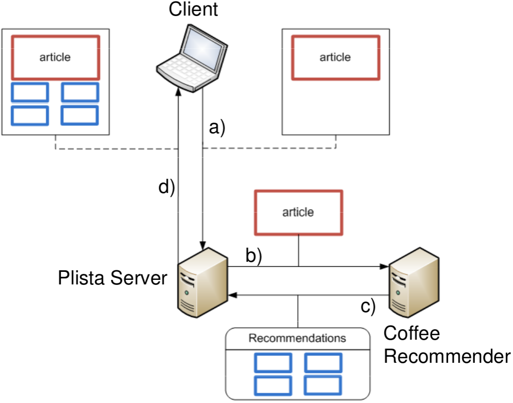 Figure 1: The CoffeeRecommender embedded in its environment. This figure is an abstraction of the environment and leaves out intermediary entities. a) When a user chooses an article on a website the Plista server is asked to provide articles that can be recommended for the reader based on the requested article. b) The recommendation request is forwarded to the CoffeeRecommender. c) The application finds the best known matches for the given article and returns them to the Plista Server. d) The Plista server returns the recommendations that are then embedded in the website of the requested article.