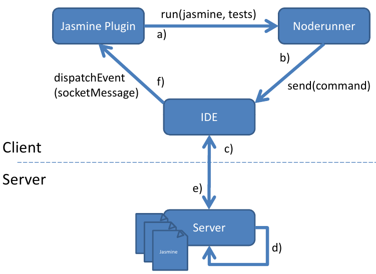 Figure 5: A simplified version of the work flow needed to execute tests. At a.) the noderunner is instructed to execute the tests with Jasmine, he forwards this call to the IDE at b.). The IDE issues the command to the server at c.). Then the server executes jasmine with the specified test files at d.). The console output of this is sent back to the IDE via socket messages at e.). The IDE emits events with these messages which our plug-in registers a listener on in order to reassemble the console output at f.)