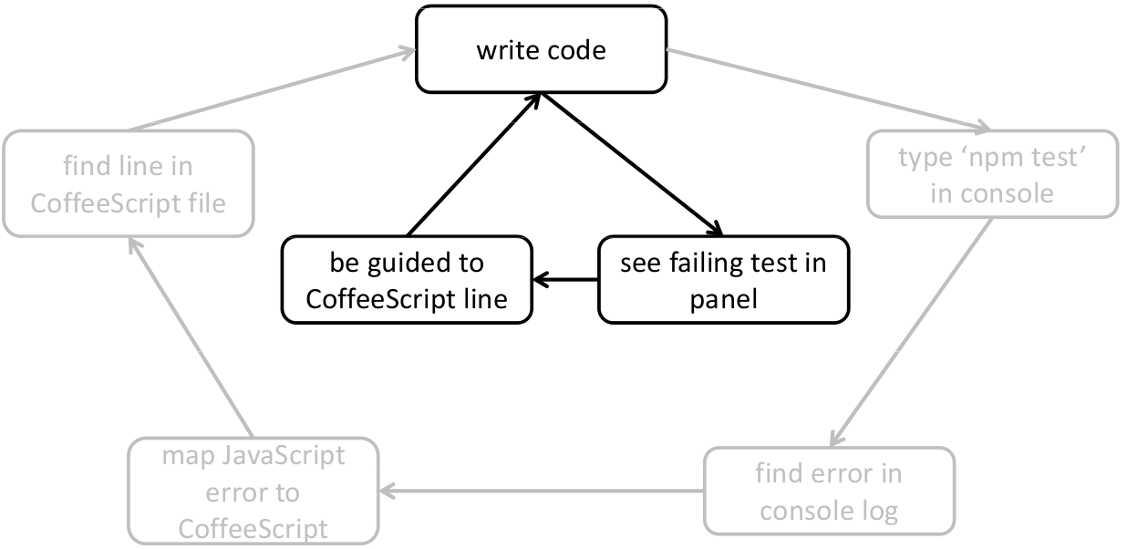 write code The programmer writes tests and the feature code that should make these tests pass and saves the changes. type ‘npm test’ in console The programmer runs the tests by switching to the console, typing this command and running all the tests present due to missing possibilities of only passing on single tests for execution. find error in console log In the console output of the test results the programmer has to look for the error she produced with the code she wrote. Figure 7 in the Appendix shows an example of such an output. The time needed to find the corresponding line in that mass of lines can become a major barrier for testing the code at all. map JavaScript error to CoffeeScript Since CoffeeScript is translated to JavaScript and then executed, the output deals with compiled JavaScript code. When the corresponding line is found in the console output it has to be mapped back to the written CoffeeScript code. Due to missing context and sparse information on the error in the console, the line has to be mapped manually by the programmer. find line in CoffeeScript file Often, the two lines the programmer is interested in tell which file of the own project fails highest in the stacktrace and what the error is. The programmer then navigates to the failing file. Unfortunately, the lines given in the console output correspond to the lines in the translated JavaScript file. Identifying the corresponding line in the CoffeeScript file with the help of the given error message can take a lot of time with a growing code base. This again increases the risk of creating a barrier to testing the code base at all. Ideally, the work flow to implement a new feature would be highly supported by an IDE to enable fast enrichment of the developed application. Unfortunately, when following TDD and using CoffeeScript in the Cloud9 IDE the programmer does not get the support needed for rapid development. How this has been improved by proper tool support by us is shown in Section4.