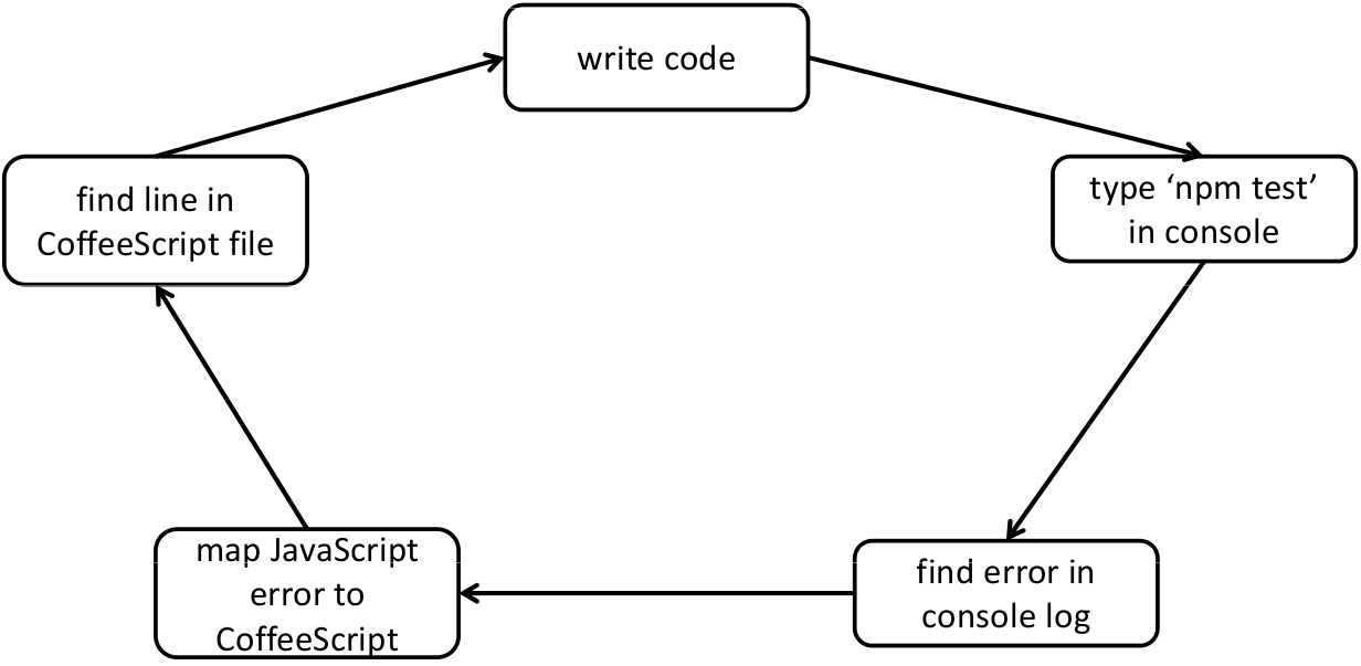 write code Write your code and then save it, this step remains unchanged. see failing test in panel As soon as you save a file ideally the corresponding test-file is executed automatically, alternatively it is possible to run tests as described in section 4.2. Now the left hand panel shows whether all tests pass or if some failed. For failing tests the error message is displayed. be guided to CoffeeScript line The user can right click on any failing test and select Show Error in Coffee. This results in the file of the project, where the error originated, being opened and the cursor to be placed in the line were the error occurred. Because of that the programmer is directly able to continue to write code to fix the bug.