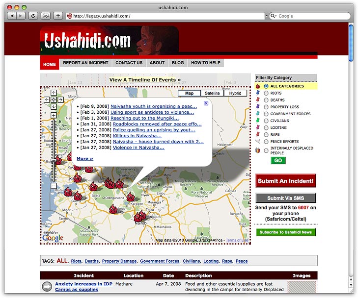 A screen shot of the original Ushahidi web mashup taken form their about page. Ushahidi means “testimony” in Swahili. It is a project that a group of programmers started in the aftermath of the 2007 presidential election in Kenia. There was a major outbreak of violence and it was simply too hard for bloggers and other people to report all the incidents of violence that eye witnesses reported to them. Enter Ushahidi. It was an application build quickly by a group of programmers to map out reports of violence on google maps, a so called “mashup”. This way they made it easy for people to report incidents of violence and made it accessible to everyone. Well everyone with an Internet connection. Ushahidi has since become a platform. Anyone can download Ushahidi and deploy it for their own purposes. For instance Ushahidi was used after the 2010 earth quake in Haiti to report events. Also Ushahidi is open source, so feel free to help improve this awesome project. You can hear more about it in this highly recommended TED Talk: Clay Shirky: How cognitive surplus will change the world