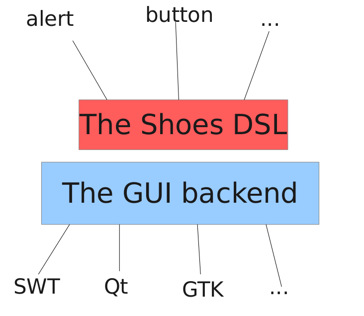 Shoes4 is a complete rewrite of its predecessor keeping its features and enhancing the DSL here ant there. “Why rewrite?” , you might ask. Well Shoes3 (or red shoes) is more of a C-project than a Ruby project. It has separate backends for each one of the major three operating systems. It’s really hard to maintain. Unfortunately there are some bugs that make the install fail on some systems, a shot at a dependency upgrade was basically a frustrating story for everybody involved, packaging (sadly) is mostly broken etc. Also there always was the dream, that shoes could be a gem. That was just hard to accomplish with shoes3, so it is an executable embedding a ruby interpreter. Over time people have also started writing their own Shoes versions. There are a lot of them out there, by our count it’s 9 versions of shoes right now. Shoes4 is an effort for all implementers to join forces and work together so shoes can be shiny and new again. To accommodate the apparent desire of people to build their own pair of shoes we now use a new architecture. Basically there is a DSL layer with all the elements that the user will interact with. This layer already implements quite some of the logic. However an exchangeable backend does the real heavy lifting of drawing etc. . So almost every DSL class has a matching backend implementation. For now the default backend implementation uses JRuby + SWT, but there also is a proof of concept backend in Qt. One of the advantages of SWT is that it aims to have a native look and feel, which is in the spirit of the original shoes. And already using a cross-platform GUI library takes a lot of load from our shoulders.