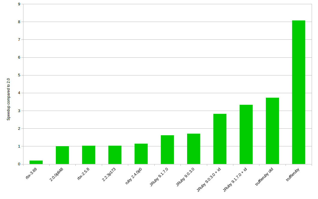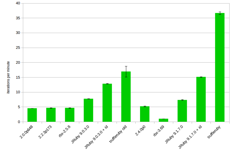 As you can see we run plenty of warmup - 3 minutes of it - and then 3 minutes of benchmarking time. So let’s see how many iterations per minute our contestants manage here: Iterations per minute - higher is better As one can see, truffleruby is leading the pack by quite a margin, followed by JRuby (but still over 2 times faster than it). Truffleruby is also an impressive 7 times faster than CRuby 2.4.0. Of course, as the new benchmark was inspired by Ruby 3.0 aiming to be 3 times as fast as Ruby 2.0 - how are we doing? Do we maybe already have a 3 times faster Ruby? Well, there is a graph for that! As we can see JRuby 9.1.7.0 run in server mode and with invoke dynamic enabled is the first one to be 3 times faster than CRuby 2.0. Also, both the old version of truffleruby and the newest are 3 times faster than our baseline - the new one even 9 times faster! CRuby 2.4 on the other hand is at about a 14% improvement as compared to 2.0. Another metric that intrigues me is how did the implementation improve in the time in between benchmarks, to gauge where the journey is going. Therefore, the next chart compares the newest version of a Ruby implementation benchmarked here against their older sibling from last time (Ruby 2.4.0 against 2.2.3, JRuby 9.1.7.0 vs. 9.0.3.0 etc.): Speedup against older version (higher is better) CRuby improved by about 11%, JRuby with invokedynamic about 18% while truffleruby, already leading the pack last time, managed another 2x performance improvement! The odd one out clearly is Rubinius that only manages bout 20% of the performance of its former version (or a 5x decrease, if you will). This seemed like a setup error on my part at first, but it is not as Rubinius removed their JIT. As this benchmark is a prime example of a pretty hot loop running, the hit of removing the JIT naturally is pretty hard. The slight decrease in JRuby performance without invokedynamic is slightly weird but it’s so small that it might as well be measurement inaccuracies. Of course, for the data fans here is the raw table: Ruby |