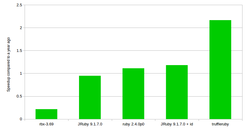 JRuby is coming along nicely, it’s the only Ruby implementation that runs this benchmark at a 3x speed of Ruby 2.0 while able to run whole Rails applications at the same time. It’s still my little personal favorite that I’d love to see more adoption of in the general ruby scene. Any time I see a talk or blog post about “Moving from ruby to the JVM for performance/Java interop” that doesn’t mention JRuby but goes straight to Java/Clojure/Scala & friends it makes me sad (nothing against those technologies though, they’re great!). JRuby at the moment also sits sort of in the middle of CRuby and TruffleRuby in other concerns - it takes more warmup time than CRuby but a lot less than TRuffleRuby while still reaching nice peak performance. The latest release also brought along some nice performance improvements and we can only expect more of those in the future.